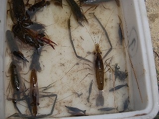 テナガエビ ミゾレヌマエビ アメリカザリガニ クロベンケイガニ カニ(名前?) モクズガニ ハグロトンボの幼虫(ヤゴ) トビケラの一種 アカムシの一種 ガガンボの幼虫 ミズムシ