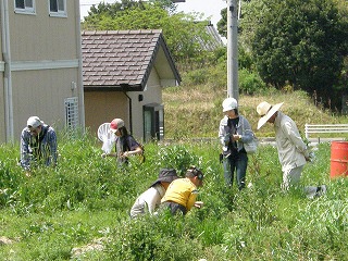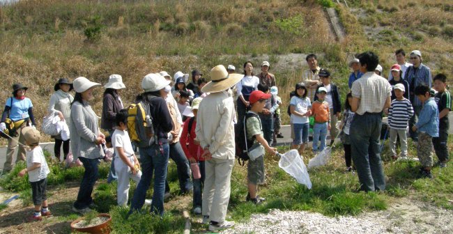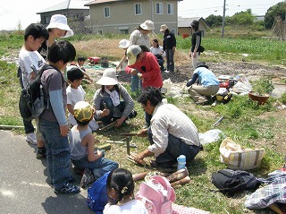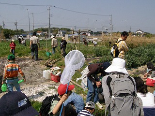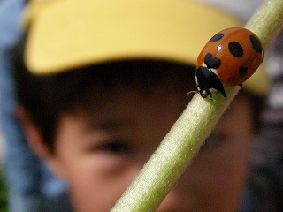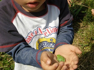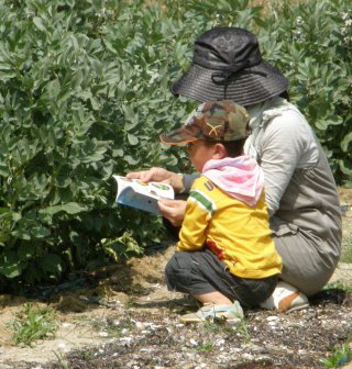 今まで計画をしたことが無いテ−マでしたが予想以上の家族が集まりました。会場は野菜を無農薬有機栽培をしている常滑市大谷の「M-easy」常滑ファームにお願いし行いました。一般に見かける畑と違い野菜とは他の雑草が同居していました。畑を管理している会員の竹内氏から茂っている雑草を取らないようお願いがありました。また、害虫も益虫も殺さないよう観察するようお願いがありました。M-easy発行の「やさいにあつまるむしずかん」を安く譲ってもらい楽しい観察をしました。