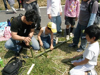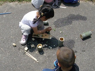 【左】竹でコップを製作 【右】おひたしを作っています。