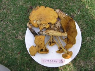 【左】八百屋さんでシメジとして売られている。ヒラタケです。 【右】苦い毒キノコのオオワライタケです。食べると幻覚作用が起きるそうです。