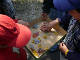 【左】会員の山本さん手作りの竹細工のチョウチョをもらって子どもたちは大喜びでした。