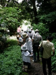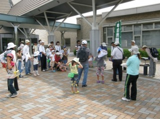 衆楽園に集合しました。前日に雨が降りオオケマイマイを探す絶好の日和でした。子ども達は、手に網と虫カゴを持ち参加しました。最初に注意事項と今日の目的のオオケマイマイの標本を見て虫とオオケマイマイを探しに出発です。公園に出るともう子ども達は虫探しに夢中です。子ども達がトンボやチョウを採れないと今度は大人の出番です。昔取った杵ずかでしょうか、とっても上手に採取して子ども達の虫カゴに入ります。そして大人が子ども達に採り方を教えています。  池には、スイレンやハスの花が咲いています。オオケマイマイは、子ども達が簡単に見つけるほど沢山いました。午前中なのにアブラゼミの幼虫らしい姿も見る事ができました。参加者も沢山見る事が出来、満足の観察会でした。(記・吉田)