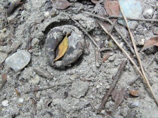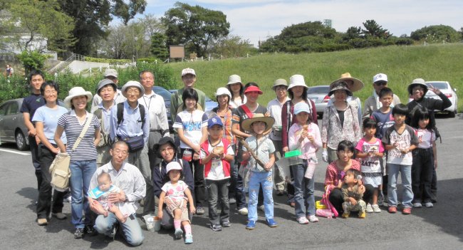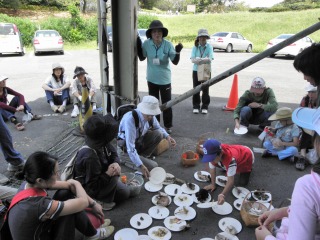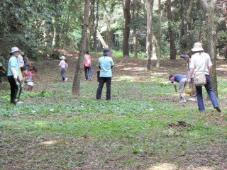 素晴らしい秋晴れ。あまりの好天続きでキノコにとっては少し期待薄か。咲き出した彼岸花が、ちょっと恨めしくも感じた。それでも参加者の皆さんはキノコとの出会いを楽しみにカゴや袋を手に集まった。降幡指導員から第三の生物である菌類の興味深いお話を聞き、それぞれの思いの場所に足を運んだ。約一時間の後、成果を見せ合ったり降幡指導員からキノコの同定と食毒の見分け方の難しさや毒性の話聞いたりした。紙皿にいろいろキノコが並び、こんなにも見つけることができたと喜びもひとしおだった。終わりには食べられるキノコのウスヒラタケの御披露目もあった。(記・村瀬)