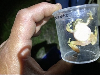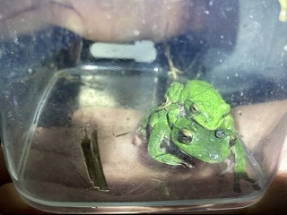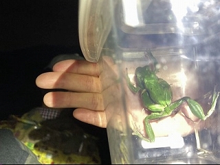 鳴いているのもシュレーゲルアオガエルとアマガエルだけだったため、限定して探せた。子どもたちが包摂中の浮いている個体をすくいあげ、その後もオスの個体が何匹も捕まえれた。
