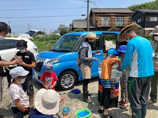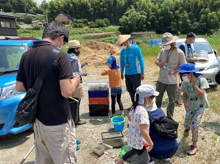 【左・右】つかまえた生きものを持って集合。これから説明会が始まる