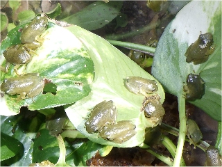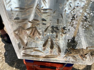 採集した生き物の分ち合いをした後、シュレーゲルアオガエルの観察会の時卵塊を持ち帰った親子がカエルになった子たちを持ってきてくれていたので、育て方を聞きながら説明しました。