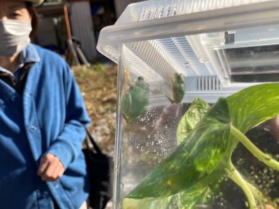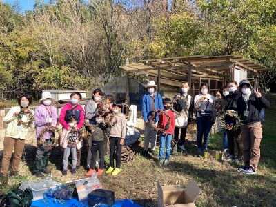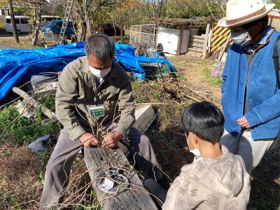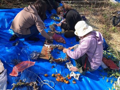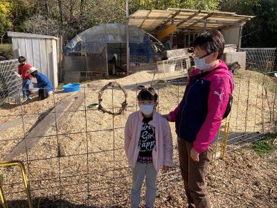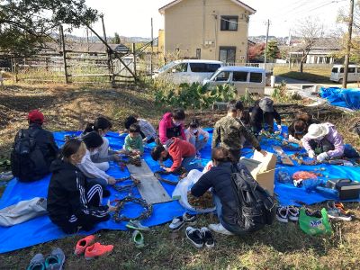 材料を持って来てくださった指導員の方たちがいて助かりました。正躬先生が用事があるにも関わらず、車の誘導をして帰って行かれました。4日前に産まれた子ヤギを預かっていたので、抱いたりミルクをあげたりできました。リースの蔓を採りに行ってから、各々素敵なリースを作ったり、籠を編んだりしていました。途中から、正躬先生のパチンコで盛り上がっていました。(記:平松裕)