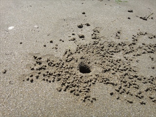 【左】スナガニだよ!    中】スナガニの穴だよ!   【右】参加者の集合写真だよ!