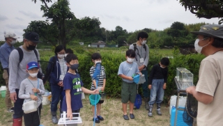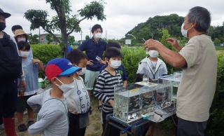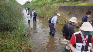この地点での観察会は久しぶりである。始めに主催方より,開催挨拶があり、観察会の指導員からは川の生き物たちがどんなところに潜んでいるか?捕え方、観察の方法、安全行動と注意事項の説明後、川の堤から梯子使いまず安全に川に入る。