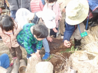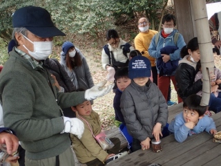 参加者の大人と子供の数はほぼ半々。小学校低学年以下の参加が多かった。そのた めか、カブトムシの幼虫が見つかると歓声が上がり、恐る恐る手の上にのせていた。 また、ミノムシという生き物の巣を見、さわってどうしてこんな風になるのか不思議 という様子が見られた。竹藪の端のコナラ類の朽ち木の中にコクワガタの幼虫を見つ けていたが、こちらは子供よりもお父さんたちの目の方がキラリと光っているように 思われた。