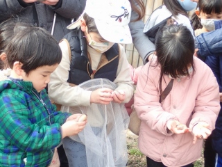 【左】集合の様子 【中】冬枯れた野原をあるきます 【右】お休み中のアマガエル