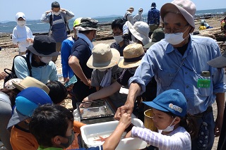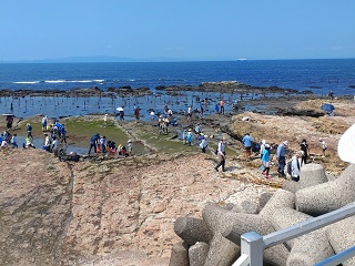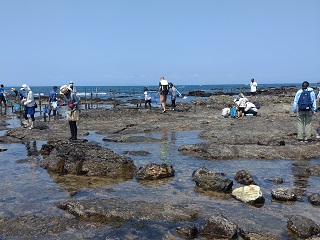 新型コロナウイルス感染症のまん延による巣ごもり状態の反動から、屋外でのイベントは多くの参加者があるだろうと準備していましたが、予想以上の125名の皆さんに集まっていただきました。愛知県の水産試験場駐車場から峠海岸までの道のりは徒歩で漁港内の生き物を観察しながら進みました。