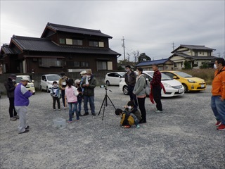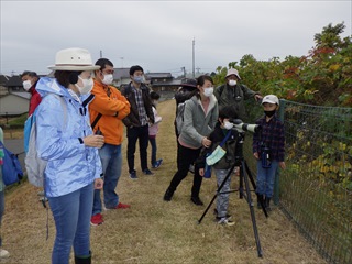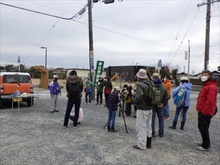 曇り空ではあったが風はなく、まあまあの観察日和。スタートしてすぐの中山新池。今年はカモ類の種も数も少ない。暖かいせいでしょうか。池の堤を渡りきる直前、カワセミが手前から飛び出し20メートルほど先の枝にとまった。ずばり見える位置だ。すぐさまレンズをセットし、みんなで観察。口々にきれい、きれいと。