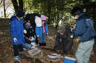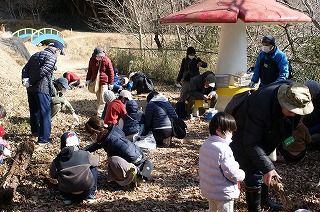 【左】雑木林で朽ち木集め 【右】キノコベンチ周りで朽ち木解体