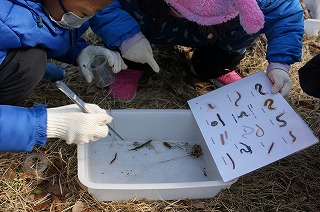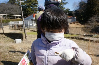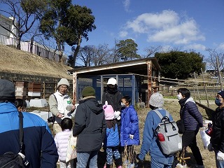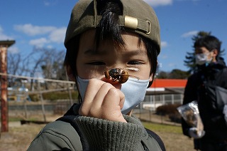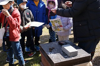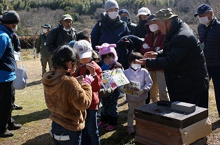 【左】みつばち牧場でミツバチのお話 【右】スズメバチの遺骸にタッチ