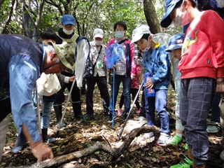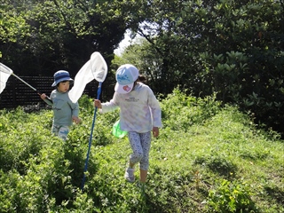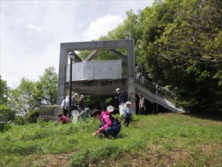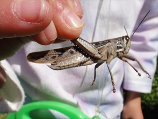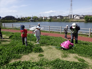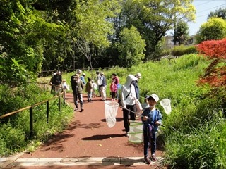 さて、観察会はコース等含めて例年通り。駐車場から下って、池岸の散策路が第一観察場所。続いて上って芝生広場から展望台までの散策路が第二観察場所。子どもたちの大好きな昆虫は、私の目からすると、正直言って、余り多くなかったが、子どもたちは懸命に探し、見つけると追っかけていた。  (記:榊原正)