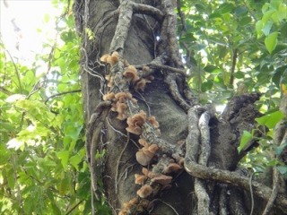 【左】展望台  【中】クロバイの花。展望台の階段から観る  【右】高い所にキクラゲがいっぱい。採れなかった