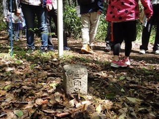 【左】三角点の説明  【中】朽ち木を、ついつい、分解。子ども…喜ぶ 【右】つかまえた→入れ物へ
