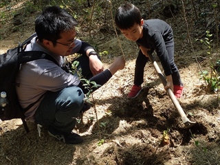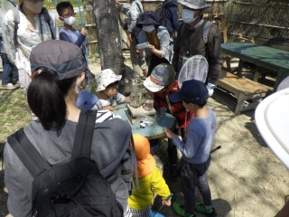 【左】タケノコ掘るぞ、よいしょ 【右】見つけた生きものの説明