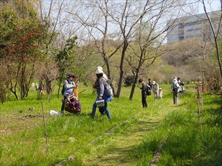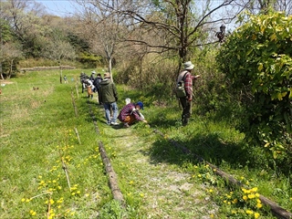 地面にはタンポポの黄色やオオイヌノフグリの青、ホトケノザやカラスノエンドウ の濃いピンク、ヒメオドリコソウのあわいピンクと春の色とりどりの野を満喫するこ とができた。 (記 竹内秀)