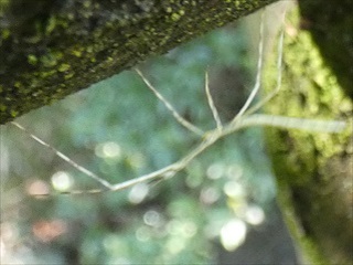 大きなタケノコがたくさんあり、若いのを探して掘り取りました。何とかして自分で掘ろうと小学生の子が頑張っていました。車まで持っていくのも苦労するほど取れた人もいて、楽しく過ごしました。竹林で食痕のあるエノキの葉裏に3匹のナナフシモドキがいました。