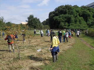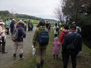 前日の夕方からの雨が上がり、小寒さを感じながらのスタート。しかし、観察会を しているうちに青空がだんだん広がって汗ばむほどの陽気。休耕田の辺りは、オギや ススキ、ヨシの穂が秋の風にゆれ、セイタカアワダチソウの群落の黄色が広がってい た。