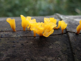 【左】秋!見っけ。柿色のカラスウリ 【右】ツノマタタケ。春〜秋に発生
