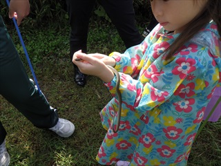 夏の間はいなかったヤギの除草作業員がのんびり草を食んでいた。子供たちはカ マキリやコオロギ、チョウ、バッタ類をとらえて楽しんだ。ヒバカリも何頭かとらえ られていた。安全なヘビだとわかると子供たちはぬるぬるしないとその手触りにおど ろいていた。アケビは、まだ固く口は開いていなかった。空中には蜘蛛のマンション ができ、冬に備えて卵を準備するための食料調達にはげむ様子がうかがえた。
