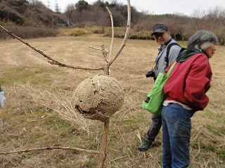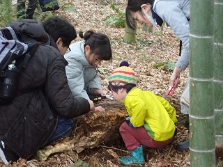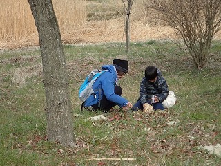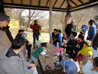 【左】冬枯れた野原をあるきます 【右】親子で鳥の観察! 【左】何かいるかなあ 【右】東屋で分かち合い、話題は豊富