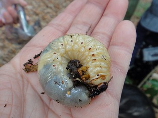 【左】虫さんのハンモック 【中】カブトムシの幼虫発見! 【右】女王の貫禄バッチリ 【左】スズバチの泥製の巣 【中】珍しいアオオサムシ 【右】カブチムシ 幼虫が沢山見つかりました