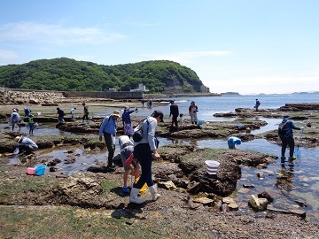 この4つだけを注意して、各自、生き物がいそうな場所で観察会がスタートしました。最後には参加者の皆さんが採取した生き物を水槽に入れてミニ水族館が完成させました。毎年、同じ時期に実施しているこの観察会は、南知多町の自然の豊かさと生物多様性を学ぶ機会として開催しており、豊浜漁業協同組合さんの特別な許可を得て実施していますので、観察会以外での採取はできませんのでご注意ください。(記:田中達)