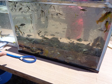 【左】採集した生き物を持ち寄っています 【右】完成したミニ水族館には色々な生き物