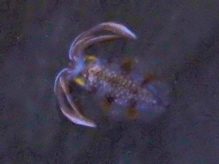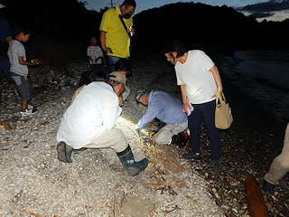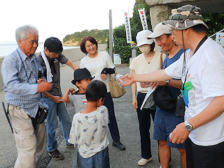しかし、人数が少なかったおかげで、参加者の子どもたちは、たも網で魚を捕ったり、護岸からイカが泳ぐ姿を見つけたりして(写真5)それなりに楽しんでいました。夏の夜に海辺を歩くということは、非日常でもありますので、楽しい経験は出来たと思いますが、ウミホタルの観察会としては失敗です。