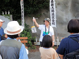 18:30に聖崎公園駐車場に集合。ウミホタルの体の仕組みと、2018年に始った夏の猛暑の影響と波の浸食によって、年々やせていく砂浜のせいか、ウミホタルの数が激減していることを説明。(写真1)事前の調査でも、ウミホタルは1匹も確認されていません。その後、参加者とともに ウミホタル捕獲罠を5つ設置。(写真2)