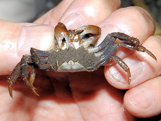 アカテガニを観察しました(写真3)最初、アカテガニは、たくさん山から下りてきていましたが,人の気配を察知して隠れてしまいました。どの個体も、おなかに卵から帰ったばかりの小さな赤ちゃんガニを抱えていました。(写真4)
