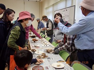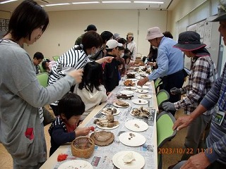 キノコは生き物として一番大きく、ナラタケでは一山全部の場合がある。食用になるもの、毒をもっているもの、麻薬となるもの、癌の治療薬となるもの、キノコの胞子が雨の核となり雨を降らせることがあることが最近分かったこと等、子供達が目を輝かせて聞いていた。協会の方がキノコにつての新聞記事を印刷して配布して下さり、皆さんの手元にあるので大変参考になった。