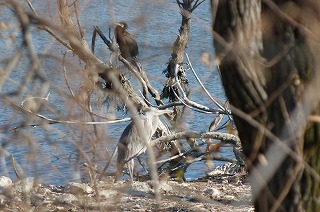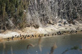 【左】カワウとアオサギ(纐纈君 撮影)   【中】岸辺のカワウ群、シラサギの仲間1羽   【右】マガモ達の昼休み