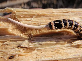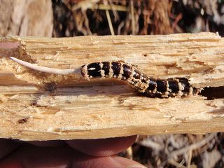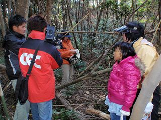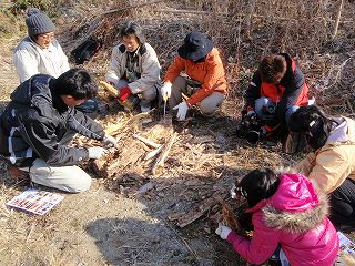 風あたりの幾分弱い路上で“朽ち木の分解”の仕方を練習し、いざ、林へと入る。道なき道を進み、朽ち木を割って中を見る。ここで、スズメバチの越冬の様子を間近でしっかり観察できました。また、特記事項としては、極めて良質な冬虫夏草を昆虫マニアのH氏が発見したことでありました。当然、指導員は大喜び。子どもは余り興味を示しませんでしたが…。