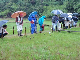 天候不順で春の訪れは遅いかと思っていましたが、ハッチョウトンボも何匹もいたし、モウセンゴケも昨年同様でした。虫さんたちも雨宿りしているのか動かないので撮影には適していたかも知れません。かたつむりもたくさん這っていて、カエルも盛んに鳴いてくれて、雨の日の観察会もいつもと違って楽しいものでした。