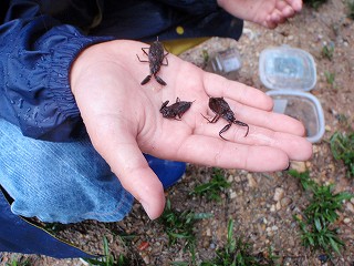 【左】アメリカザリガニをつかまえた…  【中】ヒメタイコウチ  【右】雨を避けて休むサトキマダラヒカゲ