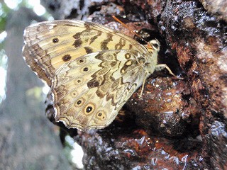 【右】ほとんど全員徒歩で…。幹の雨に当たらないところで休む蝶の観察