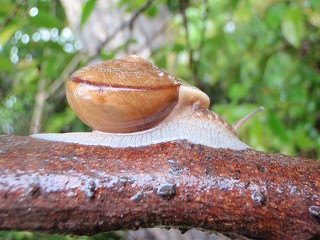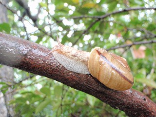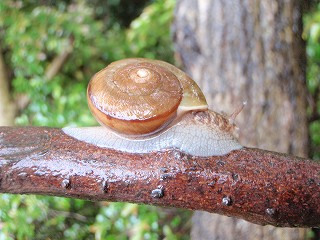 つかまえて、向きを変えて撮ったら写真[右]でした。これだと“普通”のマイマイですね…?