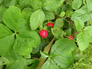 【左】ヘビイチゴ           【中】ヤマザクラのサクランボ         【右】スイカズラ(ニンドウ)
