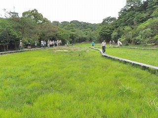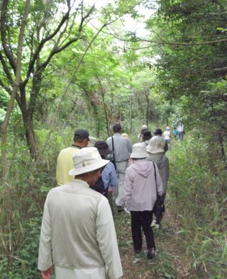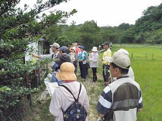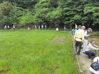 一週間前の天気予報では雨マークでしたが二日前から雨マークもなくなり山中コースを設定し草刈を前日実施、そのせいか当日は曇り空で観察日和でした。出発前にコー スの説明、湿地内での注意事項、参加者の健康状態を聞き出発する。