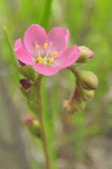 【左】たくさん開花したトウカイコモウセンゴケ  【中】トウカイコモウセンゴケの花とロゼット葉  【右】左、外来種のナガエモウセンゴケと右の在来種のモウセンゴケ