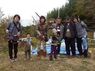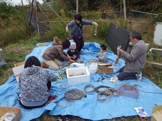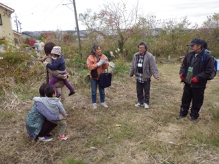 主催者あいさつの後、林の中にリースの材料採集に行く。参加の子どもたちは4歳前後の子でしたが元気いっぱい。竹林の土手もへっちゃらで登り降りしていました。昨年は参加の子どもたちは小学校高学年だったのでツルに登ったり、ターザンごっこをしたりして遊んでいましたが、さすがに今年はそれは出来ませんでした。