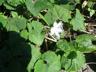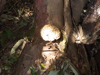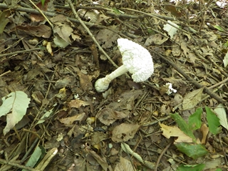 山中コースを進む内に出くわしたのはミツバアケビの鈴なり、持ち上げたり、数えたりと全員が感心する。また台風後の冷え込みからか次々と美味しそうなキノコに出くわすが残念ながらキノコに詳しい指導員は不参加、 見分けが出来れば食べる事が可能なキノコもあったかもしれませ。