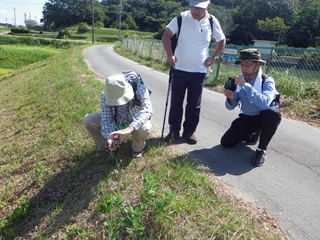 子供さんの参加を期待して台風18号で荒れた山道コースの安全確保(コース沿いの草刈り等)を図ってきたが、やけに近くの小学校からは秋の運動会の放送される声が聞こえるのみ、行事の重なりからか残念ながら子供さんの参加ゼロ。気持ちを入替え出発、野草の穂を手に子供の頃の遊び披露、これも観察会のネタの一つ話は尽きない。