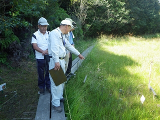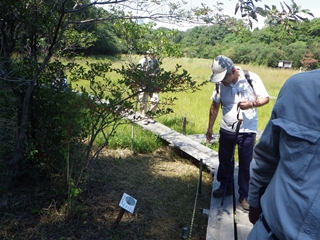 【左】おやじばっかりで…。草や木の名前を言いながら進む 【中】土手にツリガネニンジン 【右】手入れの行き届いた湿地