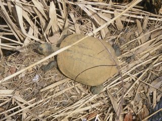 【左】赤さび色のアカミミガメ 【中】コオニタビラコ(春の七草のホトケノザ) 【右】キジの羽